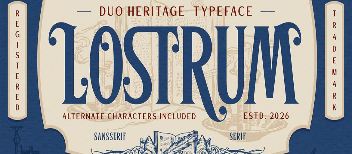 Lostrum Font is a heritage-inspired duo typeface blending an ornate serif with a refined, clean sans serif for balanced traditional and modern appeal. Influenced by vintage signage and classical European typography, it features elegant swashes and carefully structured proportions. Perfect for premium branding, editorial layouts, packaging, and luxury visuals, it delivers historical charm while remaining contemporary, making it a distinguished choice within sophisticated free fonts collections.