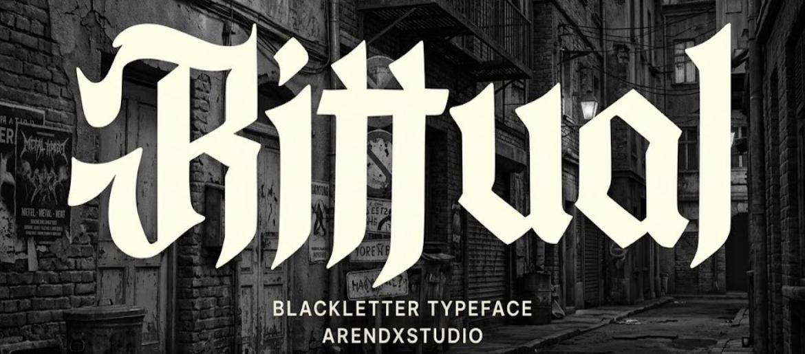 Rittual is a blackletter display typeface created as a collaboration between Arendx Studio and Rendx Otf, both based in Indonesia, and published in October 2025 as a paired release: a free demo version distributed via Behance and a complete commercial version available via Creative Market. The font sits in the ornate, high-contrast end of the blackletter tradition — a category with roots in medieval manuscript lettering that has evolved through centuries of use in contexts ranging from German newspaper mastheads and religious texts to metal band logos, tattoo lettering, and contemporary streetwear and luxury fashion branding.