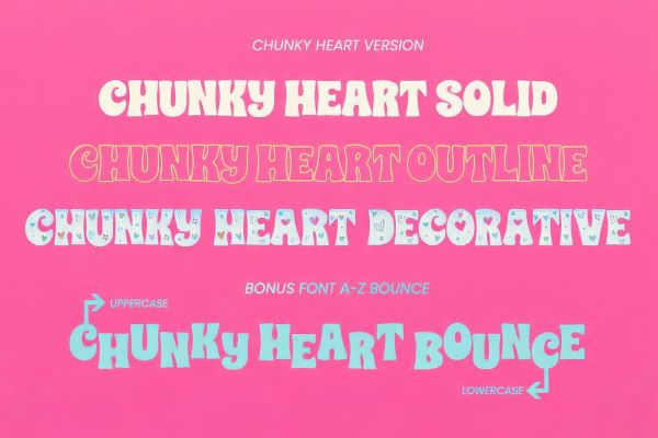 Chunky Heart Font is a Groovy Font by A Type Font that offers four different styles and a warm, playful energy that expresses love, affection, and childhood excitement through every character. Its bold, all-caps construction carries that retro groovy warmth that makes posters, sincere messages, and festive designs feel genuinely joyful and impossible to ignore.