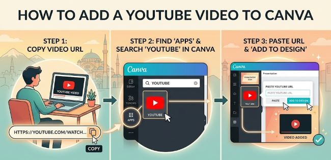 To add a YouTube video to Canva, go to Apps in the left sidebar, search for YouTube, connect your account, then search or paste the video URL to add it to your slide. The video plays directly in Canva’s Present mode and when shared as a Canva link. For the video to stay playable, keep the presentation in Canva rather than exporting it to PDF or PowerPoint.